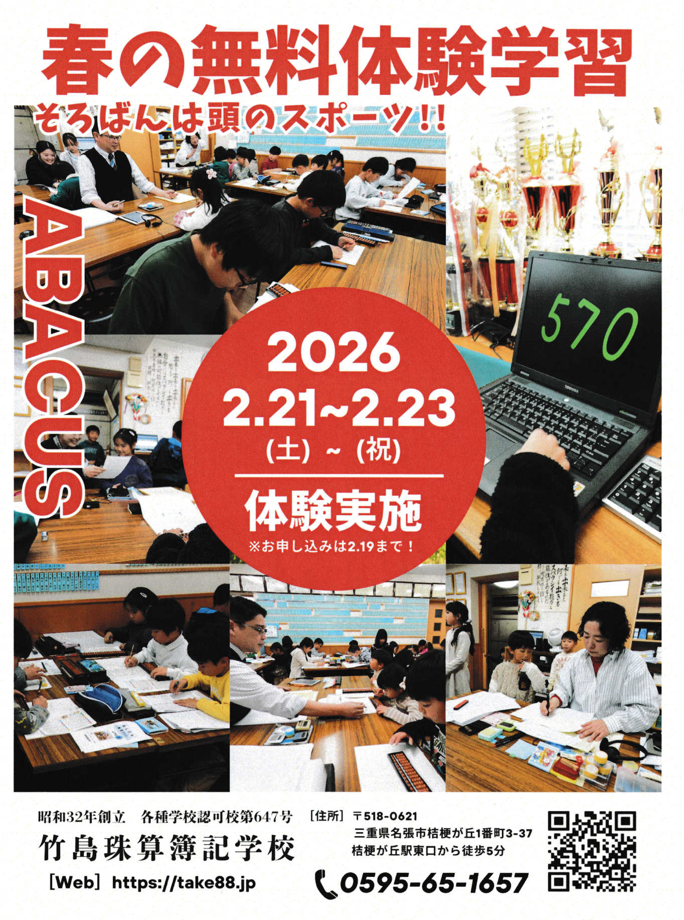- 【春の無料体験学習】そろばんは頭のスポーツ!2月21日〜23日体験実施!お申し込みは2月19日まで。詳しくはこちら